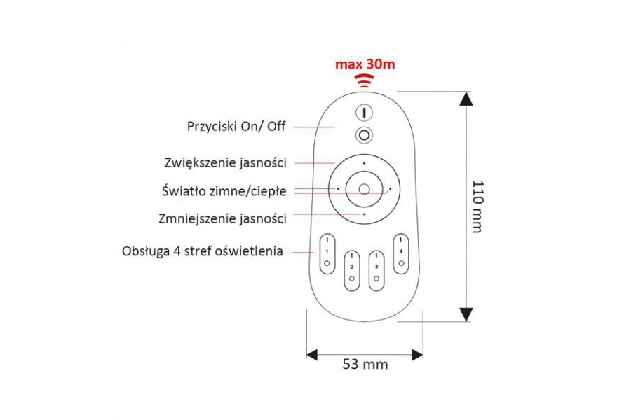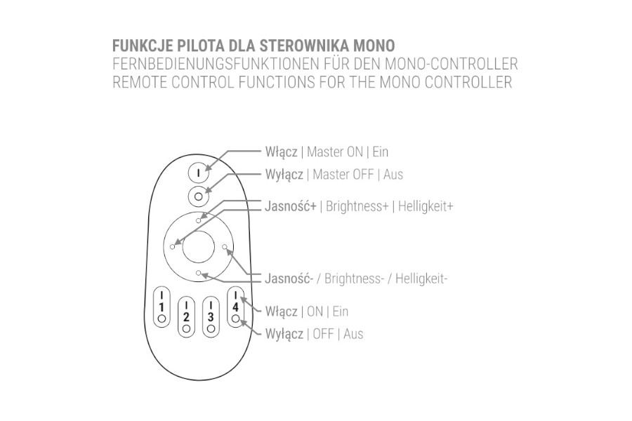 Pilot RF do sterownika MONO pozwalający na sterowanie 4 strefami oświetlenia. Możliwość włączenia oraz zmiany jasności taśmy LED. Zasięg do 30m