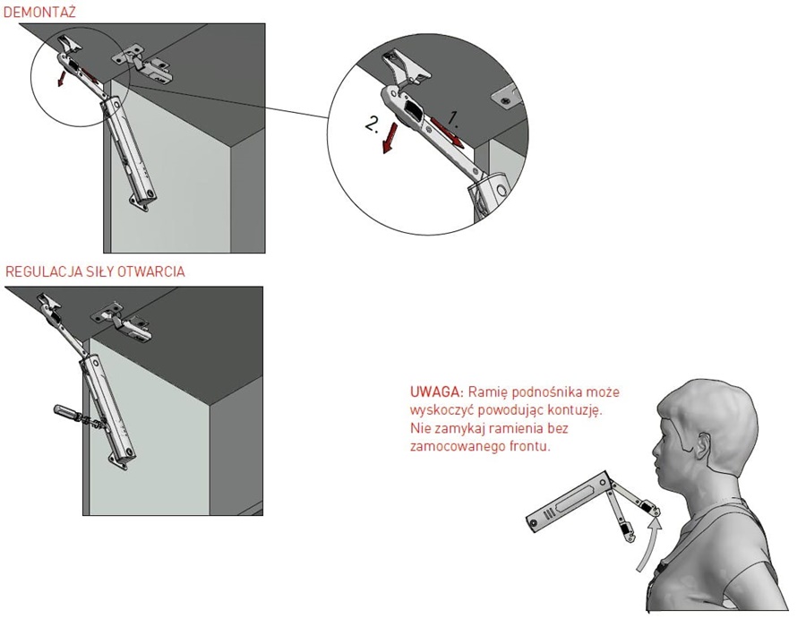 Mechaniczny podnośnik do klap górnych od firmy GTV dostępny w trzech wariantach mocowych oraz w kolorach chromu i czarnym.