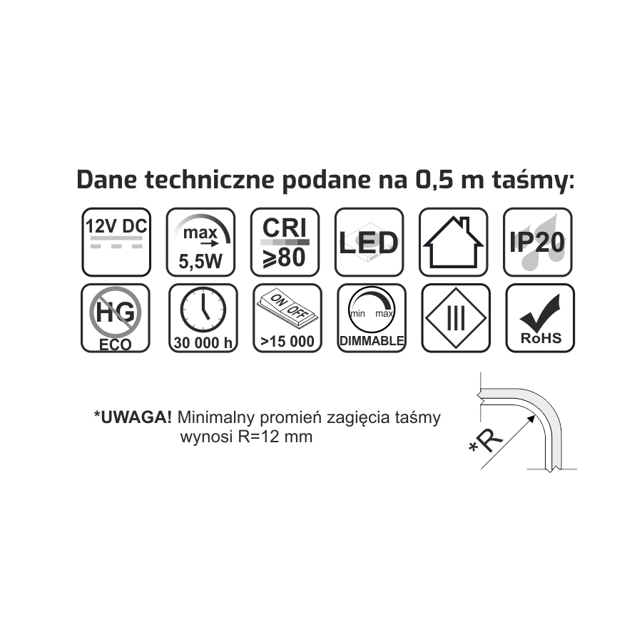 Taśma COB o ciągłym strumieniu świetlnym bez widocznych diod. Dzięki zastosowaniu diod COB taśma jest bardziej energooszczędna i ma wydłużoną żywotność. Taśmę można ciąć w wyznaczonych miejscach co 31,24mm. Szerokość taśmy to 8mm. Moc 5,5W/0,5m
