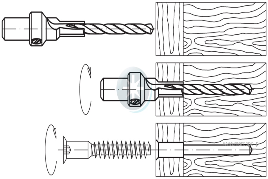Wiertło do wiercenia otworów pod konfirmaty w płytach drewnopodobnych.