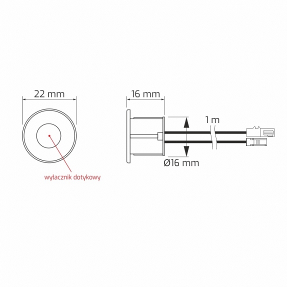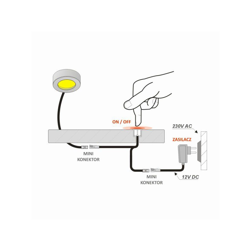 Wyłącznik do montażu w płycie meblowej, wymaga wywiercenia otworu fi16. Pozwala on na włączanie i wyłączanie oświetlenia oraz ściemnianie i rozjaśnianie. Wyłącznik zasilany napięciem stałym, należy go montować między zasilaczem a źródłem światła.